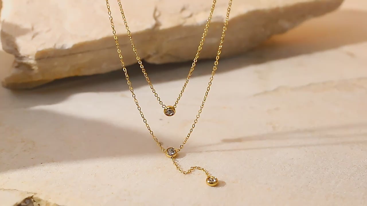 A necklace that boasts two layers adorned with three dazzling diamonds each, reminiscent of a serene waterfall's flow. Plated with 18k gold and crafted from durable stainless steel, it radiates timeless sophistication, perfect for any occasion.