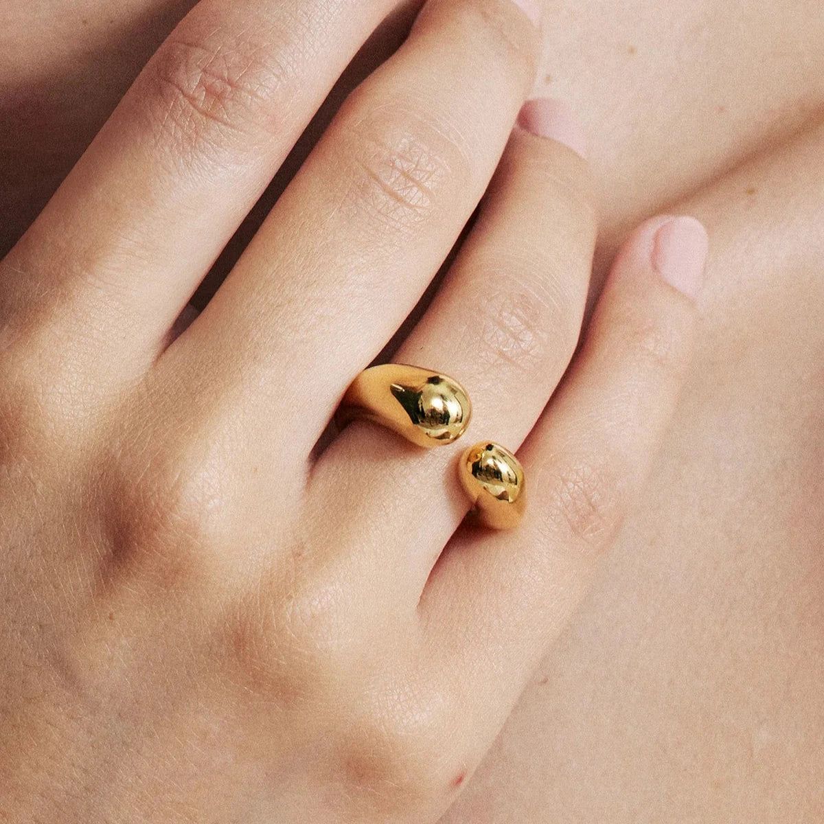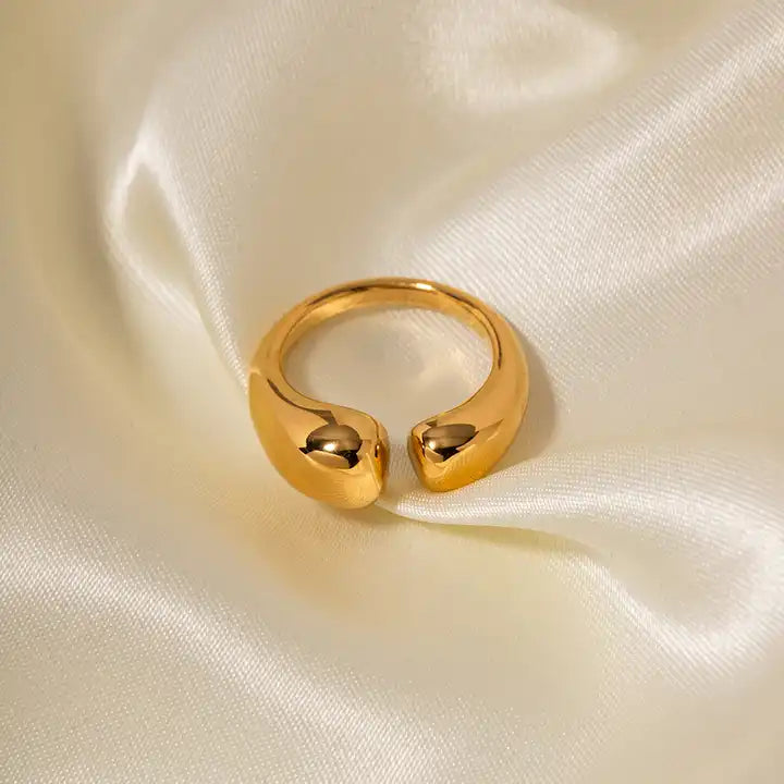 An exquisite fusion of organic beauty and contemporary design. Crafted with precision and plated in pure 18K gold, this mesmerizing ring captures the fluidity of molten metal in motion. Its asymmetrical shape and unique gap detail evoke a sense of dynamic energy and modern elegance. Wear it as a standalone statement piece or stack with other rings for a bold and distinctive look.